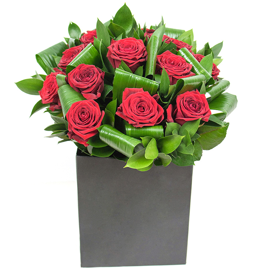 Illuminate any room with our beautiful red rose floral arrangement, featuring a graceful mix of red roses, aspidistra leaves, and ruscus. This unique bouquet radiates elegance and charm, making it an ideal gift for loved ones or a stunning addition to your home.